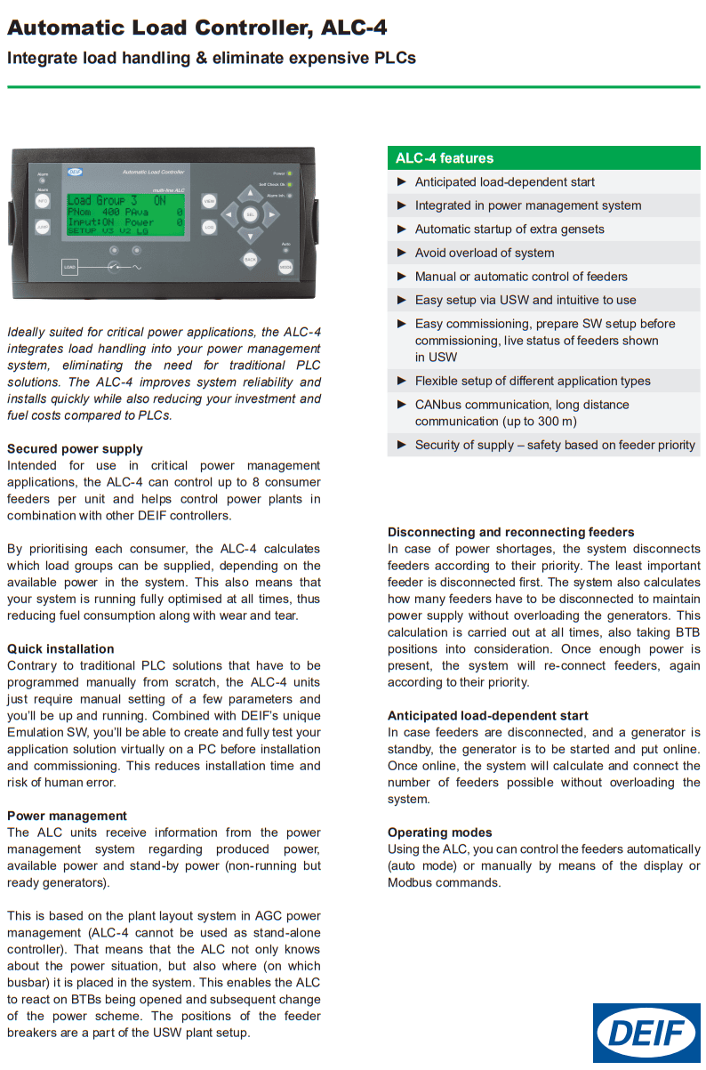 Intended for use in critical power management applications, the ALC-4 can control up to 8 consumer feeders per unit and helps control power plants in combination with other DEIF controllers.